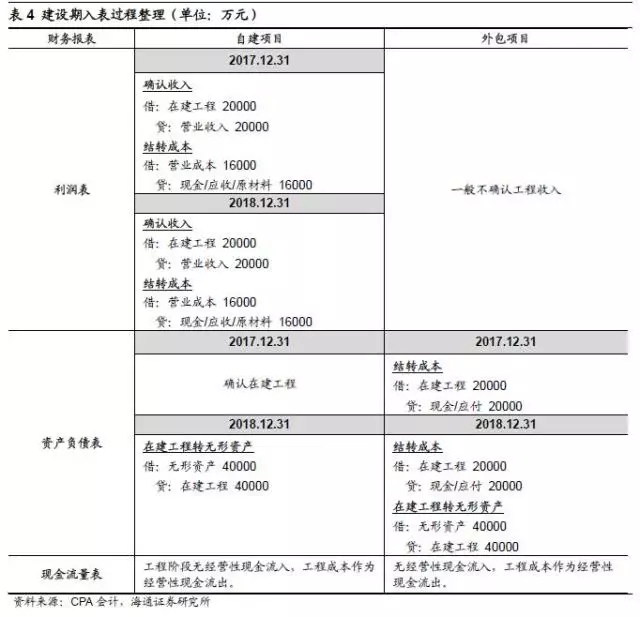 若該項(xiàng)目為項(xiàng)目公司自建,則建設(shè)期項(xiàng)目公司將根據(jù)完工進(jìn)度確認(rèn)工程收入并計(jì)入在建工程,項(xiàng)目完工后在建工程轉(zhuǎn)為無(wú)形資產(chǎn),工程階段雖有工程收入并確認(rèn)利潤(rùn),但并無(wú)實(shí)際經(jīng)營(yíng)性現(xiàn)金流入。若項(xiàng)目公司將項(xiàng)目發(fā)包,通常不確認(rèn)工程收入,即建造期不影響利潤(rùn)表,根據(jù)完工進(jìn)度向承包方支付工程款,確認(rèn)在建工程,項(xiàng)目完工后將在建工程結(jié)轉(zhuǎn)為無(wú)形資產(chǎn)。項(xiàng)目運(yùn)營(yíng)階段,公司確認(rèn)項(xiàng)目運(yùn)營(yíng)收入(主要是垃圾處理費(fèi)和上網(wǎng)發(fā)電收入),結(jié)轉(zhuǎn)相關(guān)成本,成本項(xiàng)包含無(wú)形資產(chǎn)的攤銷。項(xiàng)目建設(shè)期和運(yùn)營(yíng)期的主要會(huì)計(jì)科目錄入如表4和表5: