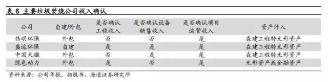 通常而言,對(duì)于垃圾焚燒BOT項(xiàng)目,如果公司自建,則會(huì)確認(rèn)工程收入,如果將項(xiàng)目外包,則不確認(rèn)工程收入。四家公司中,盛運(yùn)環(huán)保項(xiàng)目主要為自建,并且確認(rèn)工程收入,而偉明環(huán)保和中國(guó)天楹主要采取外包的方式,不確認(rèn)工程收入。綠色動(dòng)力有所不同,公司將項(xiàng)目發(fā)包給其他方,但考慮到其對(duì)項(xiàng)目負(fù)有整體履約責(zé)任并承擔(dān)所有費(fèi)用和風(fēng)險(xiǎn),在項(xiàng)目建造階段確認(rèn)相應(yīng)的建造收入,該等建造收入根據(jù)獨(dú)立評(píng)估師評(píng)定的公允價(jià)值計(jì)量。此外,盛運(yùn)環(huán)保和中國(guó)天楹確認(rèn)設(shè)備銷售收入,偉明環(huán)保與綠色動(dòng)力則不確認(rèn),四家公司都確認(rèn)項(xiàng)目運(yùn)營(yíng)收入。