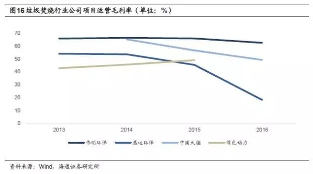 偉明環(huán)保項(xiàng)目運(yùn)營(yíng)毛利率較高,2015年為65.9%,2016年小幅下降,為62.5%;中國(guó)天楹運(yùn)營(yíng)業(yè)務(wù)毛利率也相對(duì)較高,2016年為49.2%,但相較于2014年的65.1%下滑近16個(gè)百分點(diǎn);綠色動(dòng)力2015年毛利率為49.0%;盛運(yùn)環(huán)保2015年運(yùn)營(yíng)業(yè)務(wù)毛利率為45.3%,2016年為18.0%。