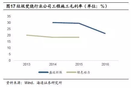 盛運(yùn)環(huán)保和綠色動(dòng)力兩家公司確認(rèn)工程業(yè)務(wù)收入。工程業(yè)務(wù)毛利率方面,盛運(yùn)環(huán)保相對(duì)較高,2015年為29.4%,2016年下降至21.3%;綠色動(dòng)力雖確認(rèn)工程業(yè)務(wù)收入,但項(xiàng)目主要系外包給其他方,建造收入根據(jù)獨(dú)立評(píng)估師評(píng)定的公允價(jià)值計(jì)量,毛利率較低,2015年為18.3%。