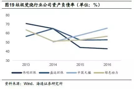 偉明環(huán)保近幾年資產(chǎn)負(fù)債率逐年下降,2016年降至43.0%;盛運(yùn)環(huán)保2015、2016年資產(chǎn)負(fù)債率維持平穩(wěn),在53%左右;中國(guó)天楹資產(chǎn)負(fù)債率呈上升趨勢(shì),從2014年的50.4%增至2016年的65.6%;綠色動(dòng)力2016年資產(chǎn)負(fù)債率小幅上升,為56.8%。