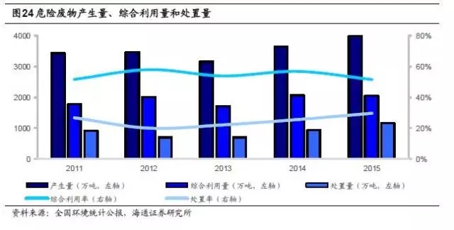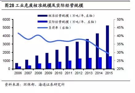 根據(jù)環(huán)境統(tǒng)計(jì)年報(bào)數(shù)據(jù),2015年全國(guó)工業(yè)危險(xiǎn)廢物產(chǎn)生量為3976萬(wàn)噸,占一般工業(yè)固體廢物產(chǎn)生量的1.22%,過(guò)去十年年均復(fù)合增長(zhǎng)率約為12%;綜合利用量為2050萬(wàn)噸,綜合利用率52%;處置量1174萬(wàn)噸,處置率30%;貯存量810.3萬(wàn)噸(含前期);危廢綜合利用處置率約為82%。根據(jù)2008年環(huán)保部公布的危廢處置名單,當(dāng)時(shí)全國(guó)1500多家具有危廢處理資質(zhì)的企業(yè)中,處理能力達(dá)到1000噸/日的企業(yè)僅占0.3%,目前行業(yè)格局沒(méi)有太大變化。