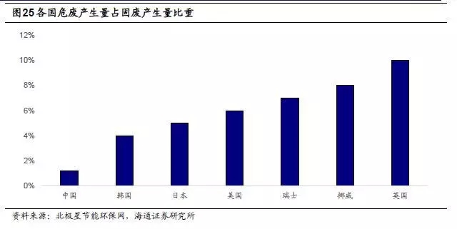 另一方面,我國(guó)危廢的實(shí)際產(chǎn)生量可能遠(yuǎn)遠(yuǎn)高于環(huán)境統(tǒng)計(jì)年報(bào)的統(tǒng)計(jì)數(shù)據(jù),很多危廢產(chǎn)生量未進(jìn)入國(guó)家統(tǒng)計(jì)口徑。根據(jù)2010年發(fā)布的《第一次全國(guó)污染源普查公報(bào)》,2007年全國(guó)工業(yè)危廢產(chǎn)量為4573.69萬(wàn)噸,已遠(yuǎn)超2015年環(huán)境統(tǒng)計(jì)年報(bào)的值。根據(jù)國(guó)外經(jīng)驗(yàn),危廢產(chǎn)生量占固廢的比重基本都在4%以上,英國(guó)更是達(dá)到10%,參考日本、韓國(guó)的數(shù)據(jù),假設(shè)中國(guó)危廢實(shí)際產(chǎn)生量占固廢比重為4%,基于環(huán)境統(tǒng)計(jì)年報(bào)數(shù)據(jù),我國(guó)2015年工業(yè)危廢產(chǎn)生量大約為1.3億噸,尚有約9000萬(wàn)噸的工業(yè)危廢沒(méi)有被納入統(tǒng)計(jì)口徑,差異主要來(lái)自于危廢產(chǎn)生企業(yè)對(duì)危廢的少報(bào)瞞報(bào),部分危廢流向沒(méi)有危廢經(jīng)營(yíng)資質(zhì)的企業(yè)處置。若以危廢實(shí)際產(chǎn)生量來(lái)看,目前危廢的有效綜合利用處置處置率還非常低,提升空間大。