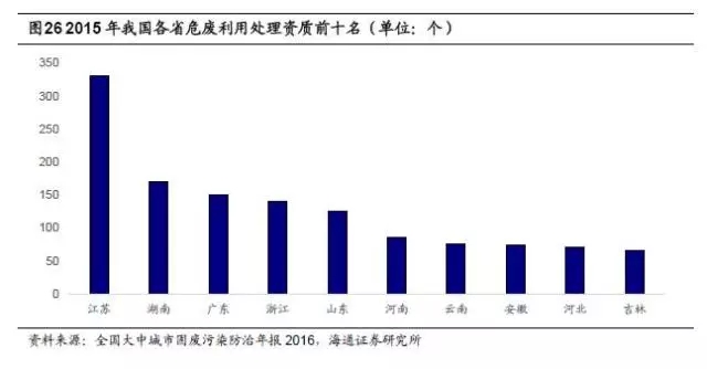 我國(guó)危廢綜合利用與處置行業(yè)格局分散,市場(chǎng)集中度較低。2015年全國(guó)危廢許可證(含醫(yī)療危廢)數(shù)量為2034個(gè),較前一年增加113個(gè),其中江蘇省頒發(fā)的危廢許可證數(shù)量為327個(gè),數(shù)量上排名第一,湖南、廣東分列二、三位,數(shù)量在150個(gè)左右,浙江、山東也超過(guò)100個(gè)。截止到2015年,全國(guó)危險(xiǎn)廢物經(jīng)營(yíng)單位核準(zhǔn)經(jīng)營(yíng)規(guī)模達(dá)到5263萬(wàn)噸/年,其中核準(zhǔn)利用規(guī)模為4155.1萬(wàn)噸/年,核準(zhǔn)處置規(guī)模為982.4萬(wàn)噸/年,平均每個(gè)許可證僅對(duì)應(yīng)2.59萬(wàn)噸/年的利用和處置能力。根據(jù)2008年環(huán)保部公布的危廢處置名單,當(dāng)時(shí)全國(guó)1500多家具有危廢處理資質(zhì)的企業(yè)中,處理能力達(dá)到1000噸/日的企業(yè)僅占0.3%,目前行業(yè)格局沒(méi)有太大變化。