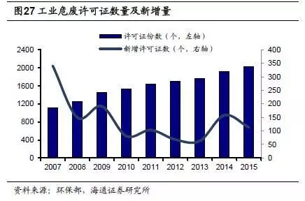 我國(guó)政府對(duì)危廢處理行業(yè)實(shí)行許可證制度。這一方面能夠保證從事危廢處理業(yè)務(wù)的公司基本擁有較強(qiáng)的技術(shù)實(shí)力和項(xiàng)目經(jīng)驗(yàn),從而保障危廢無(wú)害化處理的效率,減少處理不當(dāng)造成的二次污染;另一方面,實(shí)行許可證制度會(huì)限制新進(jìn)企業(yè)數(shù)量,限制全國(guó)危廢綜合利用和處置總量。