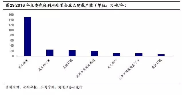 東江環(huán)保龍頭地位顯著。截止2016年底,東江環(huán)保已擁有國(guó)家危險(xiǎn)廢物名錄中46大類中的44類危廢經(jīng)營(yíng)資質(zhì),僅次于威立雅中國(guó),公司危廢利用和處置資質(zhì)近150萬(wàn)噸/年(其中無(wú)害化處置資質(zhì)達(dá)到72萬(wàn)噸/年),遠(yuǎn)遠(yuǎn)高于威立雅中國(guó),另根據(jù)公司規(guī)劃,預(yù)計(jì)到2020年總產(chǎn)能將達(dá)到350萬(wàn)噸(其中無(wú)害化產(chǎn)能達(dá)到200萬(wàn)噸),增長(zhǎng)空間可觀。
