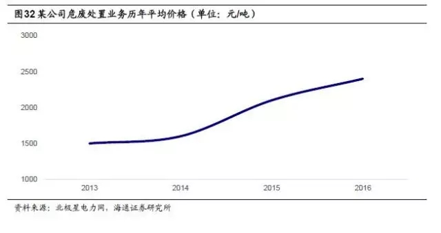危廢處置價(jià)格穩(wěn)步上升,市場(chǎng)空間巨大。從核準(zhǔn)經(jīng)營(yíng)規(guī)??矗U處置產(chǎn)能緊缺,2015年核準(zhǔn)處置規(guī)模僅982.4萬(wàn)噸/年。近年來(lái),危廢處置價(jià)格呈現(xiàn)穩(wěn)步上升趨勢(shì)。以行業(yè)內(nèi)某領(lǐng)先企業(yè)為例,2013年,其危廢處置業(yè)務(wù)平均價(jià)格為1500元/噸左右,2016年則上升至2500元/噸左右。以全國(guó)環(huán)境統(tǒng)計(jì)公報(bào)數(shù)據(jù)為基礎(chǔ),假設(shè)未來(lái)幾年危廢產(chǎn)生量保持過(guò)去十年復(fù)合增長(zhǎng)率12%的增速,保守估計(jì)處置率為35%,單位處置成本為2500元/噸,則預(yù)計(jì)2020年危廢處置市場(chǎng)為613億元,2017-2020處置市場(chǎng)空間總計(jì)2086億元??紤]到還有大量的危廢沒(méi)有進(jìn)入國(guó)家統(tǒng)計(jì)口徑,若將這些量考慮在內(nèi),市場(chǎng)空間還將提升2-3倍。