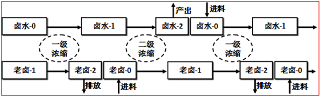 如上圖所示,老鹵和鹵水分別在正滲透膜的兩側(cè)循環(huán)流動,利用正滲透膜選擇性透過的特性,以膜兩側(cè)滲透壓差作為驅(qū)動力,將水從鹵水側(cè)遷移到老鹵側(cè),從而達到鹵水濃縮的目的。在實驗中,濃縮過程分兩步進行:首先以稀釋過的老鹵(老鹵-1)作為驅(qū)動液對納濾產(chǎn)水(鹵水-0)進行一級濃縮,濃縮過程中膜通量會逐漸減小,到達預(yù)定值時,停止?jié)饪s得到鹵水-1;然后以新的老鹵(老鹵-0)對鹵水-1進行二級濃縮,得到老鹵-1和最終產(chǎn)物鹵水-2,如圖4所示。