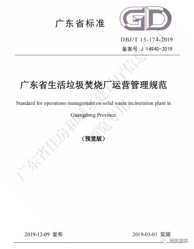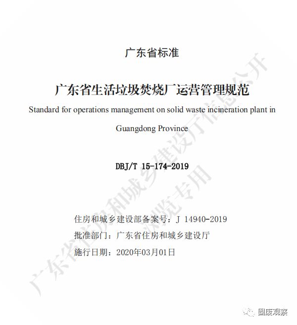 廣東省住房和城鄉(xiāng)建設(shè)廳關(guān)于發(fā)布廣東省標準《廣東 省生活垃圾焚燒廠運營管理規(guī)范》的公告 粵建公告〔2019〕82 號 經(jīng)組織專家委員會審查,現(xiàn)批準《廣東省生活垃圾焚燒廠運營管理 規(guī)范》為廣東省地方標準,編號為 DBJ/T 15-174-2019。