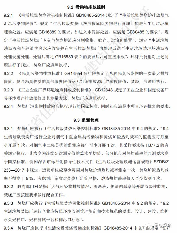 9.2.1 煙氣污染物的排放、飛灰與爐渣的處理、生活垃圾滲瀝液和車輛清洗廢水的處理 應(yīng)執(zhí)行環(huán)評批復(fù)及《生活垃圾焚燒污染控制標準》GB18485 的要求。