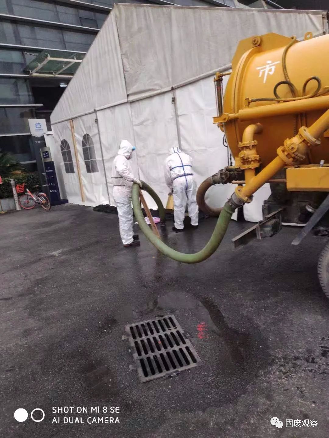 劉立山和隊(duì)友正在方艙醫(yī)院外開展吸污工作