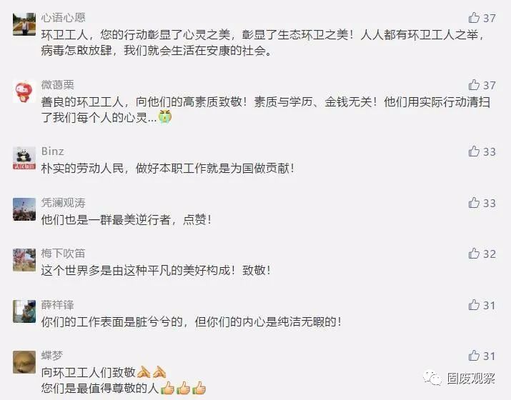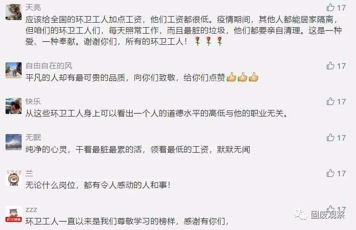 近日,荊楚網(wǎng)一篇《武漢隔離的環(huán)衛(wèi)工退房后,酒店經(jīng)理邊查房邊抹淚》的微信,讓無數(shù)讀者落淚,并紛紛點(diǎn)贊:“她們是最美最可敬的人!”“平凡的崗位造就了不平凡的人”“他們不僅打掃看得見的垃圾,還能清潔我們心靈里的灰塵”“我含著眼淚向這群擁有最美心靈的姐妹們致敬!”“平凡的人們給我最多感動(dòng)!”