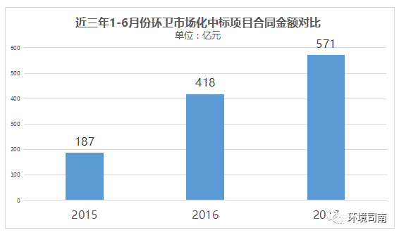 2015年之前,環(huán)衛(wèi)市場(chǎng)化進(jìn)程相對(duì)比較平靜。進(jìn)入2016年,環(huán)衛(wèi)市場(chǎng)化呈現(xiàn)出跳躍式增長(zhǎng)態(tài)勢(shì),合同金額同比(與2015年相對(duì))增幅高達(dá)223%。2017年我國(guó)的環(huán)衛(wèi)市場(chǎng)化延續(xù)了2016年的強(qiáng)勁走勢(shì),截止1-6月份合同金額接近600億元,全年將輕松跳過(guò)1000億元關(guān)口。