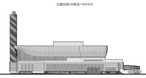 整個建筑形體如同一艘激流勇進(jìn)的大舸,在“船體”部分的幕墻采用了白色彩釉玻璃+點狀鏡面鍍層的材料。點狀鏡面對天空的反射能使建筑在一定程度上融入到背景之中。