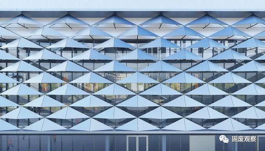 裙房部分采用了陣列分布的菱形幕墻單元,環(huán)繞建筑一周。立面形象均質(zhì)統(tǒng)一,又有豐富的光影變化,遠(yuǎn)遠(yuǎn)望去猶如一片波光粼粼的水面,十分契合武漢的地域特征。