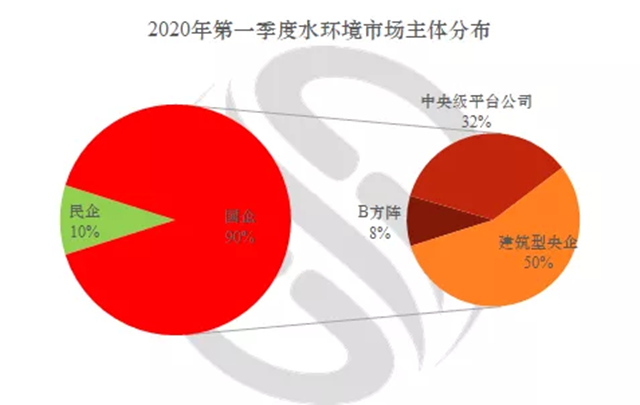 在水環(huán)境市場(chǎng)民企所獲得的市場(chǎng)份額只占一成,近九成的市場(chǎng)份額被國(guó)企拿到。國(guó)企所占的份額中,建筑型央企占50%,中央級(jí)平臺(tái)公司占比32%,B方陣占比8%。