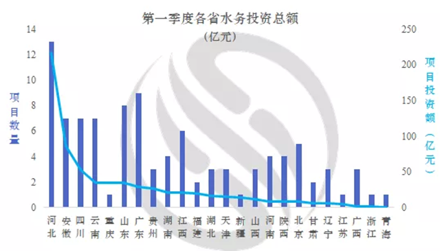 從全國(guó)范圍來(lái)看,第一季度全國(guó)有23個(gè)省市涉及水務(wù)投資運(yùn)營(yíng)項(xiàng)目。其中河北省投資額已超200億元,僅唐山市全域治水清水潤(rùn)城縣區(qū)工程PPP項(xiàng)目投資額就已達(dá)到118.08億元,是迄今為止唐山市實(shí)施的最大的PPP項(xiàng)目。安徽省投資額86億元,四川省投資額53億元,分列二、三位。