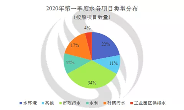 一季度水務(wù)市場(chǎng)整體概況:市政污水項(xiàng)目數(shù)量最多,占比整個(gè)水務(wù)市場(chǎng)超三成;水環(huán)境項(xiàng)目投資額占比最大,占比整個(gè)水務(wù)市場(chǎng)的近一半。(3)
