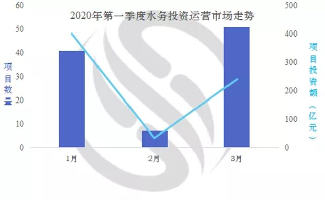 一季度水務(wù)市場(chǎng)走勢(shì):2月受疫情影響觸底,3月反彈。項(xiàng)目成交數(shù)量與去年同期相比基本持平,成交投資額甚至有所增加,增加了20%。(4)