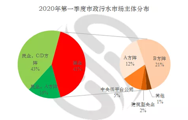 一季度水務(wù)市場(chǎng)主體:水環(huán)境市場(chǎng)以建筑型央企為主;市政污水市場(chǎng)國(guó)企/民企四六開(kāi)。