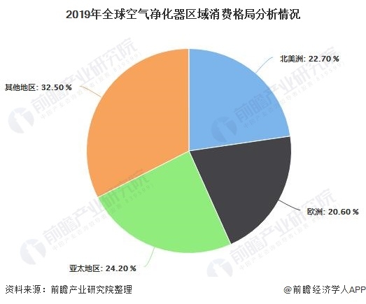 從全球空氣凈化器區(qū)域消費格局來看,2019年北美和歐洲的市場份額占比較大,分別為22.70%和20.60%,亞太地區(qū)市場份額占比為24.20%,已經(jīng)超過北美洲和歐洲,其他區(qū)域占比之和為32.50%。