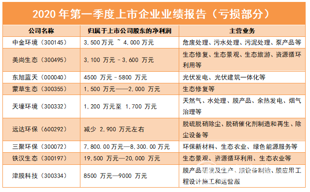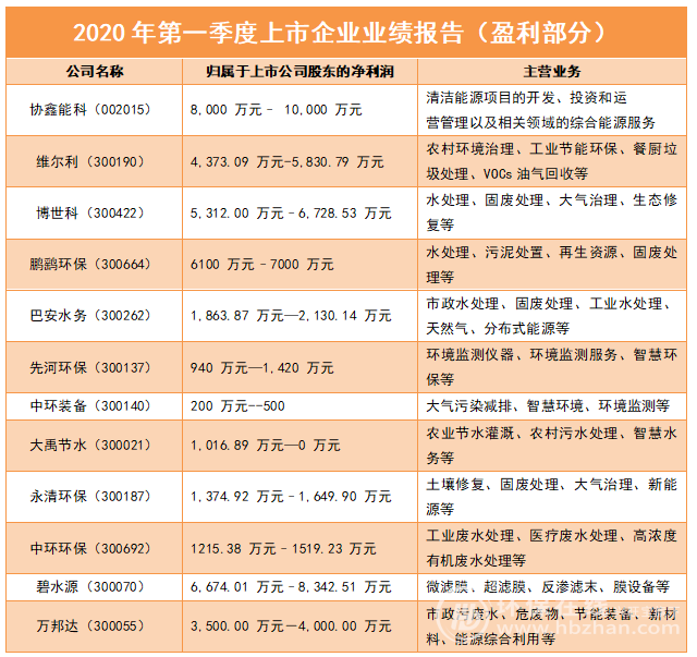 日前,多個(gè)環(huán)保企業(yè)發(fā)布了2020年第一季度(2020年1月1日-3月31日)的業(yè)績報(bào)告或預(yù)告。受疫情影響,很多工程項(xiàng)目等開工延遲、訂單減少,從而影響了很多環(huán)保企業(yè)的業(yè)績。但仍有很多企業(yè)實(shí)現(xiàn)了盈利,具體有哪些企業(yè)呢?