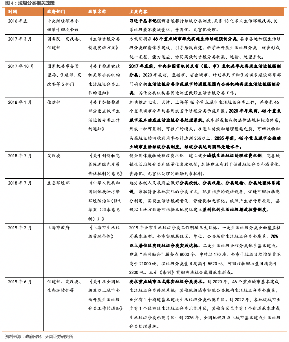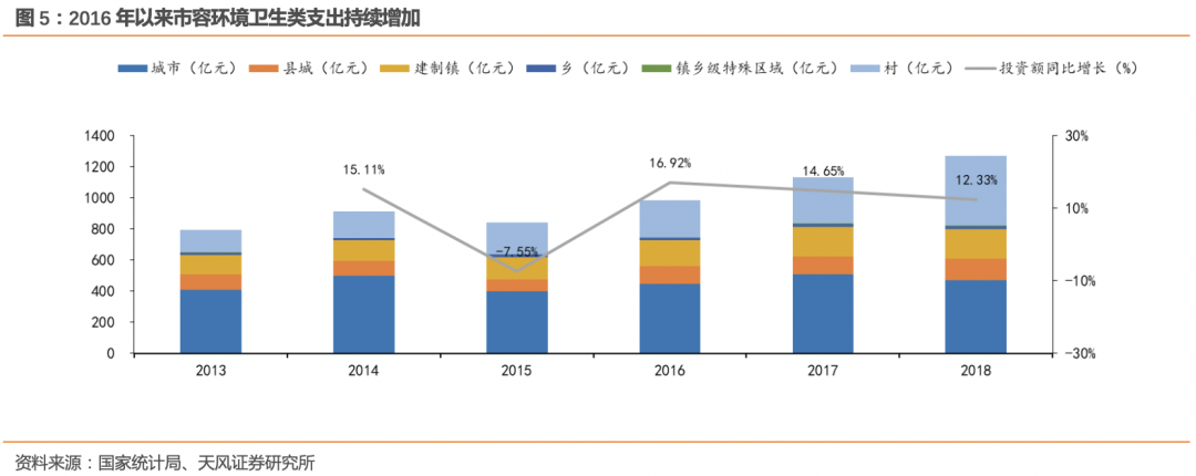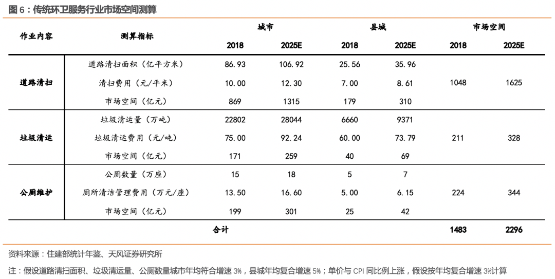 1.2. 環(huán)衛(wèi)市場(chǎng)化新增訂單連續(xù)兩年突破2000億元經(jīng)過(guò)2015年至今的快速推廣,全國(guó)環(huán)衛(wèi)行業(yè)新增年化訂單已經(jīng)達(dá)到550億,同比增長(zhǎng)12%;總合同額達(dá)到2223億元,同比略降2%;平均合同期限4年,同比下降0.6年。2018-2019年連續(xù)兩年環(huán)衛(wèi)市場(chǎng)化新增合同總金額突破2000億元,市場(chǎng)化快速推廣。1.3. 本輪環(huán)衛(wèi)市場(chǎng)化快速推進(jìn)的背后,是垃圾分類(lèi)強(qiáng)制推動(dòng)2018-2019年環(huán)衛(wèi)市場(chǎng)化快速推進(jìn)背后的主要原因,是垃圾分類(lèi)強(qiáng)制實(shí)施的政策催化。2016年底,習(xí)近平總書(shū)記在中央財(cái)經(jīng)領(lǐng)導(dǎo)小組第十四次會(huì)議上強(qiáng)調(diào)普遍推行垃圾分類(lèi)制度,2017年以來(lái)垃圾分類(lèi)相關(guān)細(xì)化政策不斷出臺(tái)。2019年上海市開(kāi)始強(qiáng)制垃圾分類(lèi),深圳、北京等城市陸續(xù)跟進(jìn),垃圾分類(lèi)從政策規(guī)劃真正走向落地實(shí)施。垃圾分類(lèi)市場(chǎng)強(qiáng)制推進(jìn),為環(huán)衛(wèi)市場(chǎng)帶來(lái)新的變化。單獨(dú)的垃圾分類(lèi)招標(biāo)項(xiàng)目增加,垃圾分類(lèi)成為環(huán)衛(wèi)一體化標(biāo)配作業(yè)內(nèi)容,和環(huán)衛(wèi)服務(wù)打包招標(biāo)。1.4. 2016年以來(lái)市容環(huán)境衛(wèi)生類(lèi)支出持續(xù)增加短期來(lái)看,環(huán)衛(wèi)行業(yè)的資金來(lái)源仍為財(cái)政資金城市環(huán)境衛(wèi)生支出。根據(jù)住建部統(tǒng)計(jì)年鑒,2018年我國(guó)城市、縣城、鎮(zhèn)、鄉(xiāng)、村等合計(jì)環(huán)境衛(wèi)生投資額1267億元,同比增長(zhǎng)12.33%。2016以來(lái)市容環(huán)境衛(wèi)生類(lèi)投資支出持續(xù)增加。2. 環(huán)衛(wèi)服務(wù)行業(yè)的市場(chǎng)空間有多大?從傳統(tǒng)環(huán)衛(wèi)向城市物業(yè)管理擴(kuò)容傳統(tǒng)環(huán)衛(wèi)行業(yè)指道路清掃、垃圾清運(yùn)、公廁管理等,而事實(shí)上,隨著政府簡(jiǎn)政放權(quán),對(duì)作業(yè)效率和作業(yè)效果的標(biāo)準(zhǔn)日益提高,單位作業(yè)單價(jià)有提升空間,新的公共服務(wù)領(lǐng)域開(kāi)始市場(chǎng)化,環(huán)衛(wèi)行業(yè)整體市場(chǎng)空間仍有很大擴(kuò)容空間。垃圾分類(lèi)、綠化養(yǎng)護(hù)、照明維護(hù)等更多內(nèi)容被納入環(huán)衛(wèi)一體化招標(biāo)訂單中,環(huán)衛(wèi)行業(yè)的內(nèi)涵日益豐富,向城市綜合管理服務(wù)邁進(jìn)。2.1. 傳統(tǒng)環(huán)衛(wèi)服務(wù)市場(chǎng)空間近1500億元,2025年可達(dá)2300億按照最新統(tǒng)計(jì)數(shù)據(jù)進(jìn)行的市場(chǎng)空間測(cè)算顯示,城市與縣城道路清掃、垃圾清運(yùn)、公廁維護(hù)等市場(chǎng)空間分別為1048億、211億、224億,傳統(tǒng)意義上的環(huán)衛(wèi)服務(wù)市場(chǎng)空間約1483億元。考慮城鎮(zhèn)化帶來(lái)的道路面積增加、和物價(jià)上漲帶來(lái)的單價(jià)提高,預(yù)計(jì)2025年傳統(tǒng)環(huán)衛(wèi)市場(chǎng)空間會(huì)提高至2296億。2.2. 垃圾分類(lèi)市場(chǎng)潛在空間800億以上,2025年可釋放近600億垃圾分類(lèi)是潛在市場(chǎng)空間接近千億的新興市場(chǎng),涉及垃圾分類(lèi)設(shè)施、垃圾分選設(shè)備、垃圾分類(lèi)服務(wù)、推廣宣傳、軟硬件IT服務(wù)、分類(lèi)實(shí)施效果測(cè)評(píng)服務(wù)、咨詢服務(wù)等。2017年垃圾分類(lèi)試點(diǎn)項(xiàng)目開(kāi)始釋放,但規(guī)模普遍偏??;2018年以來(lái),大體量垃圾分類(lèi)項(xiàng)目開(kāi)始出現(xiàn)。按照城市居民每戶20元/月,縣城居民每戶10元/月的標(biāo)準(zhǔn)進(jìn)行測(cè)算,垃圾分類(lèi)整體市場(chǎng)空間在800億以上。根據(jù)住建部的要求,全國(guó)46個(gè)城市在2020年前完成垃圾分類(lèi);到2025年,全國(guó)地級(jí)及以上城市基本建成生活垃圾分類(lèi)處理系統(tǒng)。46個(gè)城市對(duì)應(yīng)居民戶數(shù)約1億戶,按照20元/戶/月測(cè)算,2020年前將釋放的市場(chǎng)空間約242億;全國(guó)地級(jí)以上城市約2.43億戶,到2025年垃圾分類(lèi)的市場(chǎng)空間將達(dá)到583億。2.3. 城市綜合管理服務(wù)是更大的市場(chǎng)傳統(tǒng)的部門(mén)分散管理模式容易產(chǎn)生職能交叉、管理空白,管理責(zé)任機(jī)制弱化等問(wèn)題,未來(lái)城市管理從分散走向綜合是發(fā)展大趨勢(shì),可增強(qiáng)城市管理工作的綜合性、整體性和協(xié)調(diào)性。各地已在陸續(xù)推動(dòng)部門(mén)分散管理向綜合管理轉(zhuǎn)變:- 北京已成立城市管理委員會(huì),整合市政市容委全部職責(zé)的基礎(chǔ)上,將多個(gè)市級(jí)部門(mén)與城市運(yùn)行管理相關(guān)的職責(zé)一并劃歸,比如發(fā)改委的煤、電、油、氣管理,市商務(wù)委的再生資源回收管理,市園林綠化局的城市綠化帶環(huán)境衛(wèi)生管理,市水務(wù)局的城市河湖周邊環(huán)境衛(wèi)生管理等。同時(shí),財(cái)政預(yù)算維穩(wěn)資金和市政設(shè)施建設(shè)的統(tǒng)籌管理職責(zé),也將劃歸給城市管理委員會(huì)。