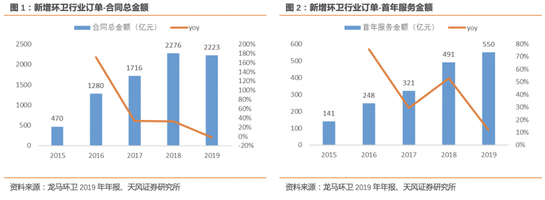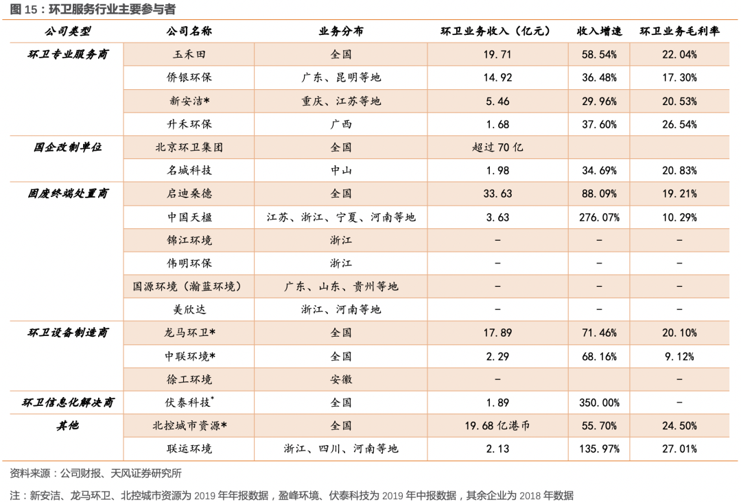 ▍環(huán)衛(wèi)行業(yè)市場(chǎng)化本輪加速的原因是什么?垃圾分類(lèi)強(qiáng)制推動(dòng)經(jīng)過(guò)2015年至今的快速推廣,全國(guó)環(huán)衛(wèi)行業(yè)新增年化訂單已達(dá)550億,總合同額達(dá)到2223億元,連續(xù)兩年環(huán)衛(wèi)市場(chǎng)化新增合同總金額突破2000億元,市場(chǎng)化快速推廣。2018-2019年環(huán)衛(wèi)市場(chǎng)化快速推進(jìn)背后的主要原因,是垃圾分類(lèi)強(qiáng)制實(shí)施的政策催化。▍環(huán)衛(wèi)服務(wù)行業(yè)的市場(chǎng)空間有多大?從傳統(tǒng)環(huán)衛(wèi)向城市物業(yè)管理擴(kuò)容傳統(tǒng)環(huán)衛(wèi)服務(wù)市場(chǎng)包括道路清掃、垃圾清運(yùn)、公廁維護(hù)等,預(yù)計(jì)每年運(yùn)營(yíng)市場(chǎng)空間在1500億,隨設(shè)施增加和單價(jià)上漲,預(yù)計(jì)2020年可達(dá)2300億。垃圾分類(lèi)市場(chǎng)是潛在市場(chǎng)空間接近千億的新興市場(chǎng),而城市服務(wù)管理是更大的潛在市場(chǎng),隨著城市管理體制從分散走向綜合,環(huán)衛(wèi)一體化項(xiàng)目增多,綠化養(yǎng)護(hù)、照明維護(hù)等更多內(nèi)容被打包進(jìn)來(lái),環(huán)衛(wèi)企業(yè)面臨的市場(chǎng)空間逐步擴(kuò)容。▍環(huán)衛(wèi)裝備行業(yè)的市場(chǎng)空間有多大?存量需求崛起根據(jù)住建部的統(tǒng)計(jì)年鑒,2018年我國(guó)城市和縣城合計(jì)的道路清掃保潔機(jī)械化率約67.68%,達(dá)到基本環(huán)衛(wèi)裝備階段?;跈C(jī)械化率提升產(chǎn)生的新增設(shè)備需求,和環(huán)衛(wèi)裝備折舊產(chǎn)生的存量替代需求,我們預(yù)測(cè)環(huán)衛(wèi)裝備存量更新需求將崛起,到2025年市場(chǎng)空間可達(dá)1025億/年,市場(chǎng)逐步釋放。▍環(huán)衛(wèi)服務(wù)的競(jìng)爭(zhēng)格局如何?市場(chǎng)分散,行業(yè)集中度提升趨勢(shì)明顯環(huán)衛(wèi)服務(wù)行業(yè)參與者眾多,top5市場(chǎng)份額僅11.4%。目前行業(yè)內(nèi)參與者可大致分為環(huán)衛(wèi)專(zhuān)業(yè)服務(wù)商、國(guó)企改制單位、固廢終端處置商、環(huán)衛(wèi)設(shè)備制造商和環(huán)衛(wèi)信息化解決商等。2019年下半年以來(lái)PPP模式預(yù)期升溫,二次市場(chǎng)化的環(huán)衛(wèi)項(xiàng)目具有一定的規(guī)?;厔?shì),從而提高行業(yè)進(jìn)入門(mén)檻,預(yù)計(jì)環(huán)衛(wèi)服務(wù)行業(yè)的集中度將獲得明顯提升。▍環(huán)衛(wèi)裝備業(yè)的發(fā)展趨勢(shì)和競(jìng)爭(zhēng)格局將如何?客戶和產(chǎn)品結(jié)構(gòu)升級(jí),競(jìng)爭(zhēng)格局穩(wěn)定隨著環(huán)衛(wèi)市場(chǎng)化推進(jìn),裝備業(yè)的市場(chǎng)化客戶占比提升,裝備產(chǎn)品向新能源、智能化方向發(fā)展,TOP3市場(chǎng)份額約40%,行業(yè)格局將維持穩(wěn)定。我們認(rèn)為環(huán)衛(wèi)服務(wù)龍頭企業(yè)將同時(shí)受益于行業(yè)空間擴(kuò)容、和市場(chǎng)集中度提升,建議關(guān)注【玉禾田】【僑銀環(huán)保】【龍馬環(huán)衛(wèi)】【啟迪桑德】【北控城市資源】【盈峰環(huán)境】【中國(guó)天楹】。環(huán)衛(wèi)裝備存量需求崛起,預(yù)計(jì)行業(yè)格局維持穩(wěn)定,建議關(guān)注【盈峰環(huán)境】【龍馬環(huán)衛(wèi)】。▍風(fēng)險(xiǎn)提示:行業(yè)競(jìng)爭(zhēng)加劇、環(huán)衛(wèi)市場(chǎng)化推進(jìn)慢于預(yù)期、存量裝備更新替代慢于預(yù)期1. 環(huán)衛(wèi)行業(yè)市場(chǎng)化本輪加速的原因是什么?垃圾分類(lèi)強(qiáng)制推動(dòng)1.1. 環(huán)衛(wèi)行業(yè)目前處于市場(chǎng)化快速推廣發(fā)展階段我國(guó)環(huán)衛(wèi)服務(wù)產(chǎn)業(yè)從建國(guó)以來(lái)經(jīng)歷了三個(gè)發(fā)展階段:- 政府行政職能主導(dǎo)管理階段:市政環(huán)衛(wèi)工作在政府主導(dǎo)下,由事業(yè)單位環(huán)衛(wèi)部門(mén)進(jìn)行監(jiān)管、實(shí)施。直到本世紀(jì)初,事業(yè)單位仍然是絕對(duì)主體,偶爾會(huì)有一些邊緣業(yè)務(wù)交給個(gè)體性質(zhì)的組織來(lái)承擔(dān),業(yè)務(wù)規(guī)模小。