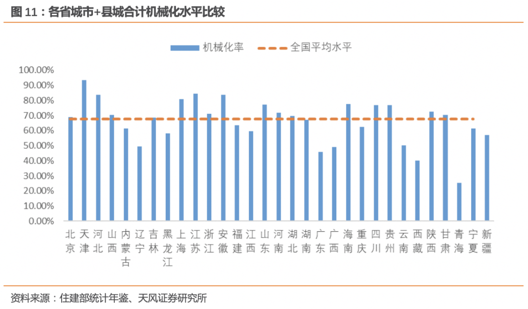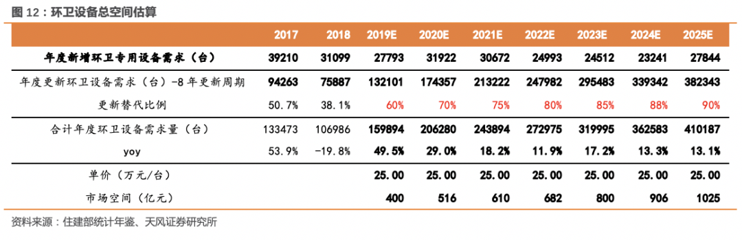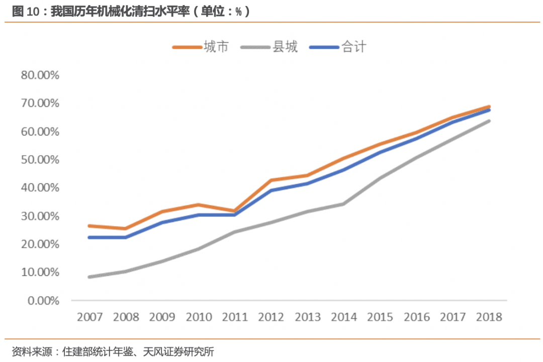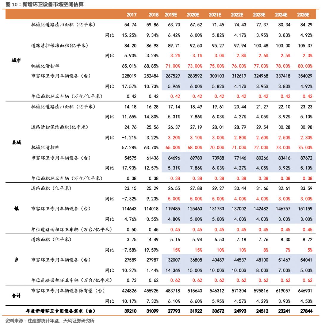 根據(jù)住建部的統(tǒng)計(jì)年鑒,2018年我國(guó)城市道路機(jī)械化率68.85%、縣城道路機(jī)械化率63.70%,城市和縣城合計(jì)的道路清掃保潔機(jī)械化率約67.68%,達(dá)到基本環(huán)衛(wèi)裝備階段。因經(jīng)濟(jì)發(fā)展水平與地域差異,不同區(qū)域間的機(jī)械化清掃水平存在差異,除省會(huì)城市和經(jīng)濟(jì)較發(fā)達(dá)地級(jí)市外,其他城市和縣城距離實(shí)現(xiàn)全面環(huán)衛(wèi)裝備階段還有差距。3.2. 機(jī)械化率存在提升空間,年度新增設(shè)備需求2-3萬(wàn)臺(tái)/年根據(jù)住建部相關(guān)文件的要求,到 2020 年底前,地級(jí)及以上城市建成區(qū)道路機(jī)械化清掃率達(dá)到70%以上,縣城達(dá)到 60%以上,京津冀及周邊地區(qū)、長(zhǎng)三角地區(qū)、汾渭平原等重點(diǎn)區(qū)域要顯著提高。根據(jù) 2018 年《中國(guó)城鄉(xiāng)建設(shè)統(tǒng)計(jì)年鑒》計(jì)算,2018 年我國(guó)城市道路清掃面積 86.93億平方米,機(jī)械化清掃面積 59.86億平方米,機(jī)械化清掃率為 68.85%;縣城道路清掃保潔面積 25.56億平方米,機(jī)械化清掃面積16.80億平方米,機(jī)械化清掃率僅為 63.70%。我們基于機(jī)械化率提升和單位面積環(huán)衛(wèi)車(chē)輛的假設(shè),對(duì)新增環(huán)衛(wèi)車(chē)輛市場(chǎng)需求進(jìn)行估算,假設(shè)2019-2025年:- 城市道路清掃保潔面積年均復(fù)合增速3%左右,城市機(jī)械化率可逐步提升至80%,單位面積環(huán)衛(wèi)車(chē)輛維持0.42萬(wàn)臺(tái)/億平米;
