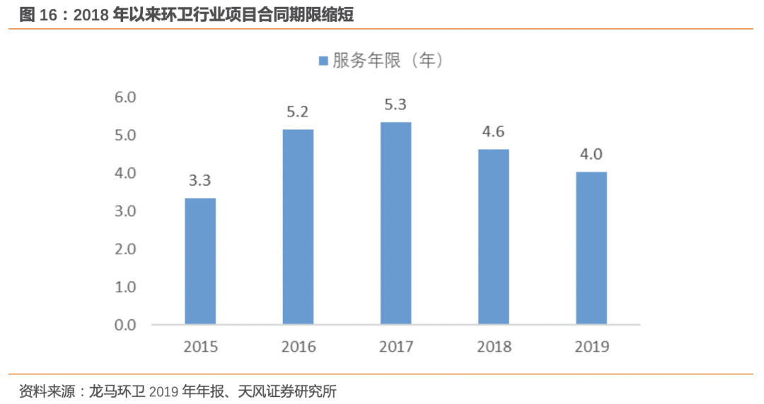 4.2. 行業(yè)參與者增多,跑馬圈地正當(dāng)時(shí)環(huán)衛(wèi)行業(yè)巨大的市場(chǎng)空間和良好的商業(yè)模式,吸引各方社會(huì)資本加入,2018年行業(yè)參與者約4000余家,前五大企業(yè)市場(chǎng)份額約11.4%。目前行業(yè)內(nèi)參與者可大致分為以下幾類(lèi):環(huán)衛(wèi)專(zhuān)業(yè)服務(wù)商如玉禾田、僑銀環(huán)保、新安潔、升禾環(huán)保等;國(guó)企改制單位,如北京環(huán)衛(wèi)集團(tuán)、名城科技等;固廢終端處置商,如啟迪桑德、中國(guó)天楹、錦江環(huán)境等;環(huán)衛(wèi)設(shè)備制造商,如龍馬環(huán)衛(wèi)、中聯(lián)環(huán)境;環(huán)衛(wèi)信息化解決商,如伏泰科技;以及其他新進(jìn)入者,如北控城市資源、聯(lián)運(yùn)環(huán)境等。4.3. PPP模式預(yù)期升溫,資金門(mén)檻提升環(huán)衛(wèi)服務(wù)按照政府招標(biāo)模式一般分為政府購(gòu)買(mǎi)服務(wù)或PPP兩類(lèi),政府購(gòu)買(mǎi)服務(wù)一般運(yùn)營(yíng)期限較短,約3-5年;PPP模式的環(huán)衛(wèi)項(xiàng)目一般體量較大,運(yùn)營(yíng)期限約15-30年。2018年P(guān)PP模式降溫,平均合同期有所縮短:行業(yè)發(fā)展初期訂單以政府購(gòu)買(mǎi)服務(wù)方式為主;2016-2017年P(guān)PP模式訂單快速增長(zhǎng),訂單平均運(yùn)營(yíng)期限拉長(zhǎng);2018年以來(lái),受PPP政策監(jiān)管影響,PPP模式訂單增速放緩,訂單平均運(yùn)營(yíng)期限有所縮短。自2019年下半年以來(lái),PPP模式類(lèi)項(xiàng)目預(yù)期有所升溫,主要由于垃圾分類(lèi)帶動(dòng)下的中轉(zhuǎn)設(shè)備、中轉(zhuǎn)設(shè)施、末端處置設(shè)施建設(shè)資金需求,帶動(dòng)環(huán)衛(wèi)訂單從單一的環(huán)衛(wèi)清掃保潔,向環(huán)衛(wèi)一體化方向發(fā)展,PPP模式類(lèi)項(xiàng)目往往伴隨著前期資金的投入,將提高行業(yè)資金門(mén)檻。4.4. 二次市場(chǎng)化帶來(lái)新機(jī)遇,提升環(huán)衛(wèi)行業(yè)集中度雖然環(huán)衛(wèi)行業(yè)市場(chǎng)化訂單整體增速有所放緩,但我們注意到隨著首次市場(chǎng)化的環(huán)衛(wèi)項(xiàng)目合同到期,大量環(huán)衛(wèi)項(xiàng)目迎來(lái)二次市場(chǎng)化。在城市管理由分散走向綜合,以及大力發(fā)展垃圾分類(lèi)的背景下,二次市場(chǎng)化的環(huán)衛(wèi)項(xiàng)目普遍具有規(guī)?;?、一體化、智能化的趨勢(shì),行業(yè)進(jìn)入門(mén)檻提高,行業(yè)集中度將不斷提升。以深圳市環(huán)衛(wèi)項(xiàng)目為例,深圳市現(xiàn)有的環(huán)衛(wèi)管理業(yè)務(wù)包括“市政道路清掃保潔、生活垃圾收集、運(yùn)輸及處理,公廁管理等”,實(shí)行市、區(qū)、接到三級(jí)管理體制。1984年,深圳市在全國(guó)率先推動(dòng)道路清掃保潔市場(chǎng)化;1993年,深圳市環(huán)衛(wèi)處將清掃保潔業(yè)務(wù)管理權(quán)限移交給區(qū)一級(jí);1999年,深圳市環(huán)衛(wèi)處將垃圾運(yùn)輸作業(yè)管理權(quán)限下放到區(qū)一級(jí);2019年深圳市引入環(huán)衛(wèi)PPP模式:- 2019年9月27日,深圳市第一個(gè)環(huán)衛(wèi)PPP項(xiàng)目——深圳市福田區(qū)政府環(huán)衛(wèi)PPP項(xiàng)目公開(kāi)招標(biāo),盈峰環(huán)境全資子公司中聯(lián)環(huán)境中標(biāo),總金額11.53億元,服務(wù)周期10年。