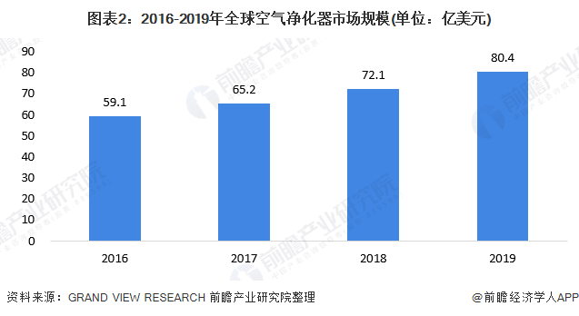 根據(jù)GRAND VIEW RESEARCH發(fā)布的數(shù)據(jù),2016-2019年全球空氣凈化器市場規(guī)模復(fù)合年增長率為10.8%,2019年全球空氣凈化器市場規(guī)模近80.4億美元。