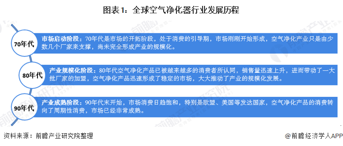 從全球空氣凈化產(chǎn)業(yè)的發(fā)展來看,隨著空氣凈化技術(shù)的演變發(fā)展壯大,全球空氣凈化器行業(yè)大致經(jīng)歷了三個階段: