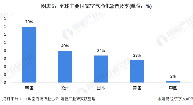 發(fā)達(dá)國家空氣凈化器的普及率遠(yuǎn)高于發(fā)展中國家,其中韓國的普及率達(dá)到了70%,歐洲空氣凈化器的普及率為40%