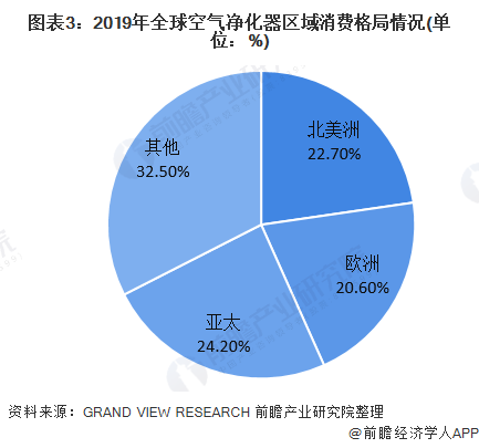 2019年北美和歐洲的空氣凈化器消費(fèi)量較大,分別占總消費(fèi)量的22.70%和20.60%,亞太地區(qū)空氣凈化器消費(fèi)比重為24.20%,已經(jīng)超過北美洲和歐洲,其他區(qū)域占比之和為32.50%。