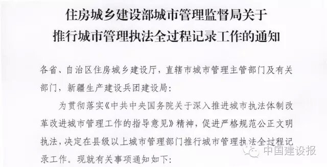 各省、自治區(qū)住房城鄉(xiāng)建設廳,直轄市城市管理主管部門及有關部門,新疆生產(chǎn)建設兵團建設局:為貫徹落實《中共中央國務院關于深入推進城市執(zhí)法體制改革改進城市管理工作的指導意見》精神,促進嚴格規(guī)范公正文明執(zhí)法,決定在縣級以上城市管理部門推行城市管理執(zhí)法全過程記錄工作?,F(xiàn)就有關事項通知如下:各地城市管理部門要通過文字、音像等記錄方式,對執(zhí)法活動全過程進行記錄,客觀、公正、完整地記錄執(zhí)法工作情況和相關證據(jù),實現(xiàn)全過程留痕和可回溯管理。規(guī)范執(zhí)法文書的制作和使用,確保執(zhí)法文書和案卷完整準確、合法規(guī)范。合理配備并使用執(zhí)法記錄儀等現(xiàn)場執(zhí)法記錄設備和視音頻資料傳輸、存儲、等設備。對現(xiàn)場執(zhí)法活動中容易引發(fā)爭議和糾紛的,應當實行全過程音像記錄。積極利用大數(shù)據(jù)、云計算、物聯(lián)網(wǎng)等信息技術,結合數(shù)字化城市管理平臺建設和辦公自動化系統(tǒng)建設等,探索成本低、效果好、易保存、不能刪改的音像記錄方式,提高執(zhí)法記錄的信息化水平。做好執(zhí)法文書和視音頻資料的管理和存儲,逐步實現(xiàn)與數(shù)字化城市管理信息系統(tǒng)關聯(lián)共享。建立健全執(zhí)法全過程記錄保存、管理、使用等工作制度。定期組織對執(zhí)法文書和視音頻資料進行抽查檢查。充分發(fā)揮全過程記錄信息在案卷評查、數(shù)據(jù)統(tǒng)計分析、執(zhí)法監(jiān)督等工作中的作用。各地要充分認識推行城市管理執(zhí)法全過程記錄工作的重要意義,切實落實工作要求,配備相關儀器設備,嚴格規(guī)范記錄行為,妥善保管使用記錄信息,確保執(zhí)法全過程記錄工作有效推行。住房城鄉(xiāng)建設部城市管理監(jiān)督局
