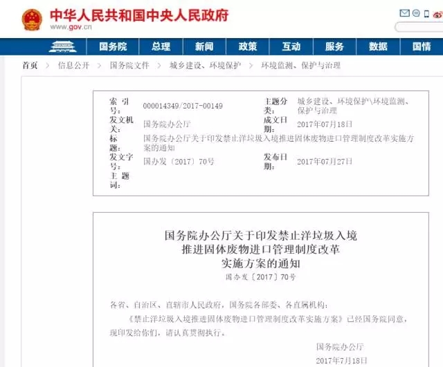 7月27日,國(guó)務(wù)院辦公廳正式發(fā)布禁止洋垃圾入境推進(jìn)固體廢物進(jìn)口管理制度改革實(shí)施方案。明確2017年年底前,全面禁止進(jìn)口環(huán)境危害大、群眾反映強(qiáng)烈的固體廢物;2019年年底前,逐步停止進(jìn)口國(guó)內(nèi)資源可以替代的固體廢物。