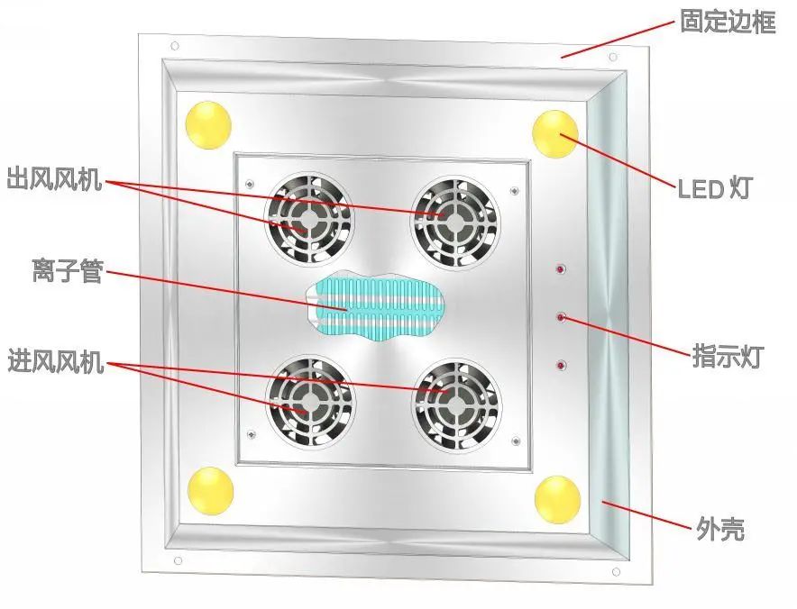 本產(chǎn)品安裝于室內(nèi)吊頂天花板上,內(nèi)部為離子管和紫外燈管雙重消毒過(guò)程,在四組節(jié)能靜音風(fēng)機(jī)作用下,通過(guò)使室內(nèi)空氣循環(huán)經(jīng)過(guò)離子與紫外過(guò)程,紫外燈用來(lái)破壞細(xì)菌病毒中的DNA(脫氧核糖核酸)或RNA(核糖核酸)的分子結(jié)構(gòu),造成生長(zhǎng)性細(xì)胞死度亡和(或)再生性細(xì)胞死亡,達(dá)到殺菌消毒的效果;離子發(fā)生器同時(shí)產(chǎn)生的正離子與負(fù)離子在空氣中進(jìn)行正負(fù)電荷中和的瞬間產(chǎn)生巨大的能量釋放,從而導(dǎo)致其周?chē)?xì)菌結(jié)構(gòu)的改變或能量的轉(zhuǎn)換,從而致使細(xì)菌死亡,實(shí)現(xiàn)其殺菌的作用。由于負(fù)離子的數(shù)量大于正離子的數(shù)量,因此多余的負(fù)離子仍然飄浮在空氣中,可以達(dá)到消煙、除塵、消除異味、改善空氣的品質(zhì),以改善室內(nèi)環(huán)境。