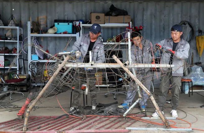 上海閔行區(qū)浦錦街道的“兩網(wǎng)融合”中轉(zhuǎn)服務(wù)站成立了一個(gè)利用廢棄物制作藝術(shù)品的團(tuán)隊(duì)。這是團(tuán)隊(duì)成員郭宇(左)、劉景強(qiáng)(中)和李剛在中轉(zhuǎn)服務(wù)站工棚內(nèi)工作(5月27日攝)。新華社記者 方喆 攝