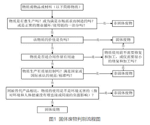 導(dǎo)則第三部分列出了“固體廢物與非固體廢物判別流程圖”(見圖1),該“流程圖”有5層判斷項(xiàng),其中有4個(gè)判斷項(xiàng)可以得出“非固體廢物”的屬性。其中在第2項(xiàng)判斷為“有價(jià)值”的基礎(chǔ)上的后續(xù)3個(gè)判斷,可以看做對于廣義價(jià)值的選擇和控制。即“基本保留原有用途的價(jià)值+符合相關(guān)產(chǎn)品標(biāo)準(zhǔn)+可直接用作替代產(chǎn)品,且使用過程環(huán)境無害”。