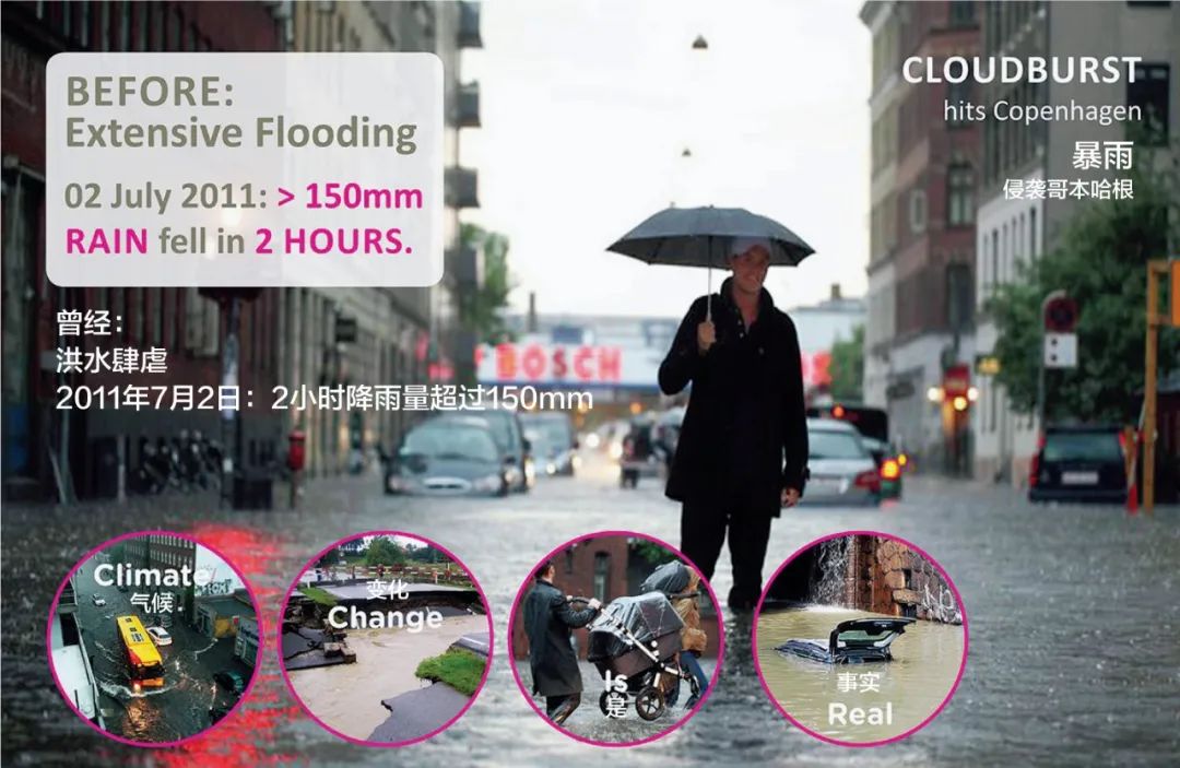 2010年8月與2011年8月,哥本哈根市在兩年內(nèi)接連遭受了三次毀滅性的暴雨襲擊。從統(tǒng)計數(shù)據(jù)看,三次暴雨均為百年一遇的極端降水事件,盡管理論上它們在12個月內(nèi)連續(xù)發(fā)生的概率極低。然而,統(tǒng)計數(shù)據(jù)是一回事,現(xiàn)實卻是另一回事。這些暴雨災害也許正是氣候變化為現(xiàn)代城市敲響的警鐘。在這些暴雨事件中,哥本哈根不可計數(shù)的高速公路、主干道、列車軌道和其他基礎設施被淹沒在洪水中,同樣被淹的還有大量的商店與住宅。這三次特大暴雨所造成的經(jīng)濟損失累計達到80億元人民幣。