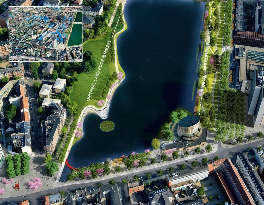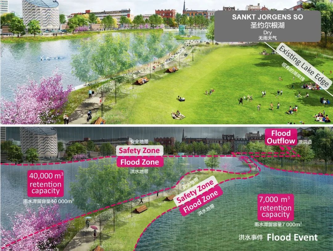 我們的具體策略之一是雨水滯留公園,這是我們的海綿城市“暴雨防控方案”中的一個關鍵要素。眾所周知,景色怡人的“藍綠公園”能夠為居民健康帶來巨大裨益,而經(jīng)過設計,這些公園也可以成為吸納特大洪水的“海綿”。該規(guī)劃充分利用哥本哈根市區(qū)三大內(nèi)湖之一的圣約爾根湖,通過將湖水水位由5.8m降低到2.8m,使其成為一座風景秀美的湖濱公園。在提升城市休閑娛樂價值的同時,海綿城市設計也為城市創(chuàng)造出一大片雨水集蓄區(qū)。而傳統(tǒng)的工程設計方式則只能通過建造巨型的、造價高昂的泄洪道或管網(wǎng)來傳輸雨水——而鑒于大型暴雨事件十分罕見,這些設施在絕大多數(shù)情況下都將處于閑置狀態(tài)。與埋設地下雨洪排水管的工程造價相比,建造于地上的圣約爾根湖方案將節(jié)省大約10億元人民幣。通過這一看似簡單的景觀設計策略,安博實現(xiàn)了以遠低于傳統(tǒng)水泥蓄水池的成本來建造巨型蓄水設施的目標。更為重要的是,人們可以走進我們新建的藍綠公園,享受閑暇與歡愉。