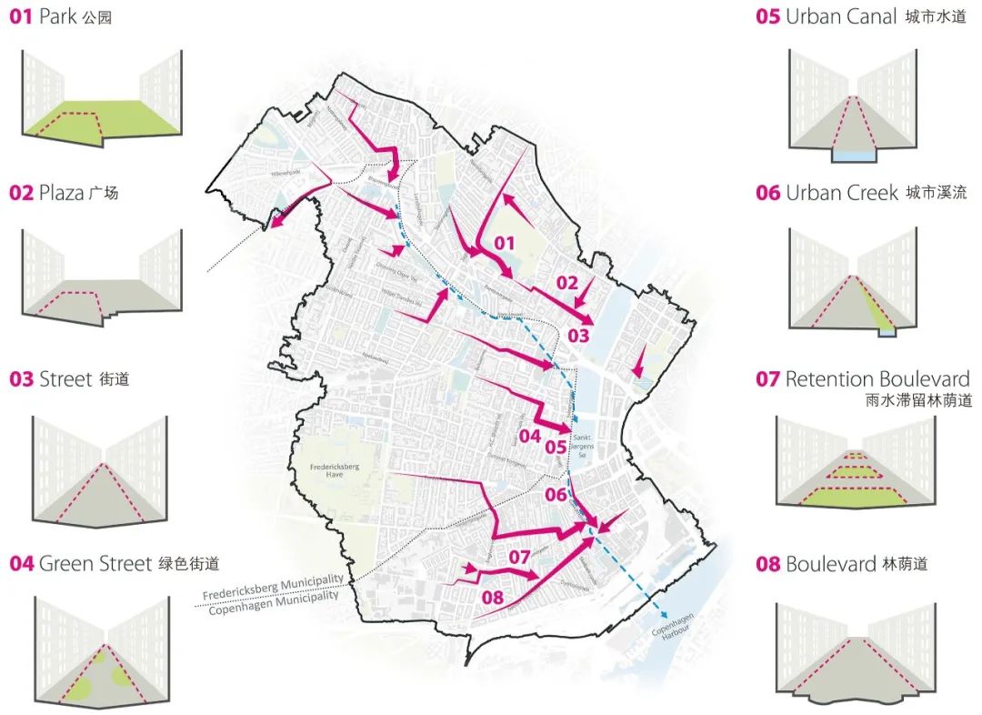 整合后的規(guī)劃將為城市帶來諸多額外效益。隨著對總體規(guī)劃愿景的細化,哥本哈根城區(qū)被分為8個區(qū)域,每個區(qū)域作為一個獨立的集水區(qū),均需要更為細致的具體規(guī)劃方案。安博負責其中4個區(qū)域的具體實施方案設計,其中包括暴雨街道、雨水滯留街道、綠色街道的具體設計,及如何通過這些方案實現(xiàn)提升城市宜居性的總體目標。