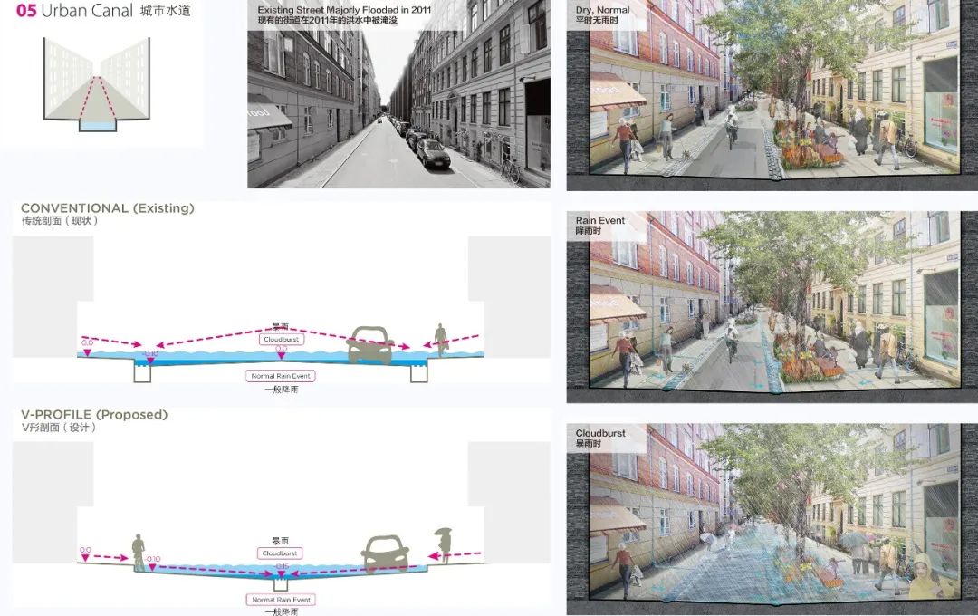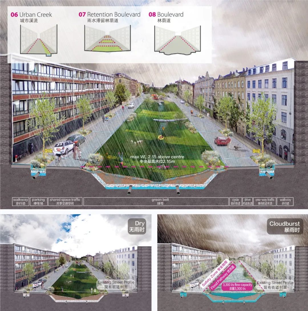 哥本哈根暴雨防控詳細規(guī)劃采用截然不同的方式來設計這些大道。新設計的林蔭道將道路剖面變?yōu)椤癡”形,使中間的綠化低地形成一條巨大的海綿滯流帶。暴雨天氣時,雨水將從兩側(cè)的建筑物流向中間綠化帶。索恩德大道在暴雨天氣下的徑流流量將達到3.3m3/s。而在正常降雨及無雨天氣時,低洼的綠帶則可成為周邊居民的休閑場所。
