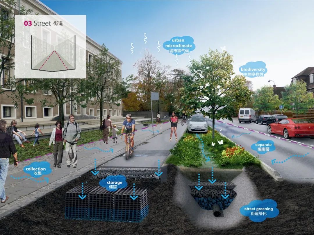 另一個用來緩解極端暴雨影響的具體策略是雨水滯留街道。這些街道通常是位于低洼、脆弱區(qū)域上游的次級道路,通過街道內(nèi)部的設計來創(chuàng)造巨大的蓄水空間。在不對交通產(chǎn)生重大妨礙的情況下,這些次級道路通??杀桓脑斐捎晁疁艚值馈Mㄟ^增加洼地、透水鋪裝等方式實現(xiàn)對雨水的滯留,并可以凈化雨水,從而實現(xiàn)對地下含水層的補給。