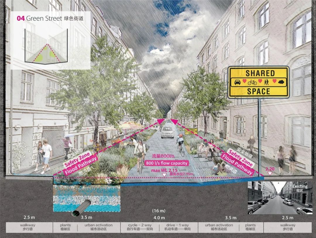 在這份詳細規(guī)劃中,多功能區(qū)域發(fā)揮著舉足輕重的作用。公園與操場等空地可在暴雨天氣時被淹沒,而在無雨的日子作為休閑空間供市民使用。在空間彌足珍貴的高密度城市環(huán)境中,提供可以用于休閑娛樂的多功能空間無疑是極為必要的。此外,這種“海綿”可以成為激活灰色城市空間的引擎。