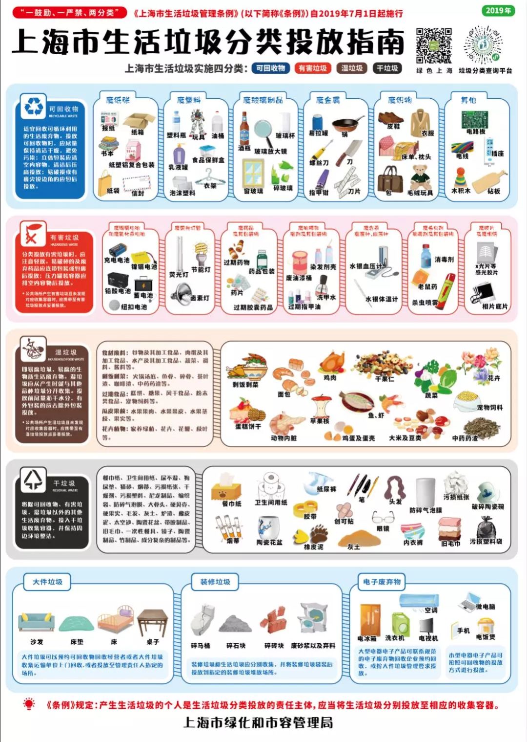 2019年,《上海市生活垃圾管理?xiàng)l例》頒布施行,全市1.3萬余個居村分類達(dá)標(biāo)率由2018年年底的15%提高到90%,單位分類達(dá)標(biāo)率達(dá)到87%,135個街鎮(zhèn)成功創(chuàng)建為“示范街鎮(zhèn)”,10個區(qū)創(chuàng)建成為“示范區(qū)”,下發(fā)首批71個垃圾分類示范街鎮(zhèn)專項(xiàng)補(bǔ)貼??苫厥瘴锘厥樟?049噸/日、環(huán)比增長431.8%,有害垃圾分出量0.6噸/日、環(huán)比增長504.1%,濕垃圾分出量7453噸/日、環(huán)比增長88.8%,干垃圾處置量17731噸/日、環(huán)比下降17.5%。完成2.1萬余個分類投放點(diǎn)規(guī)范化改造,完成4萬余只道路廢物箱標(biāo)識更新,配置及涂裝237輛可回收物回收車、87輛有害垃圾車、1461輛濕垃圾車和3079輛干垃圾車,建成可回收物回收服務(wù)點(diǎn)1.5萬個、中轉(zhuǎn)站201個、集散場10個,餐廚廢棄油脂收運(yùn)、處置閉環(huán)管理落實(shí)到位。干垃圾焚燒和濕垃圾資源化利用總量從1.4萬噸/日提高到2.1萬噸/日,生活垃圾填埋比例從41.4%下降到20%。