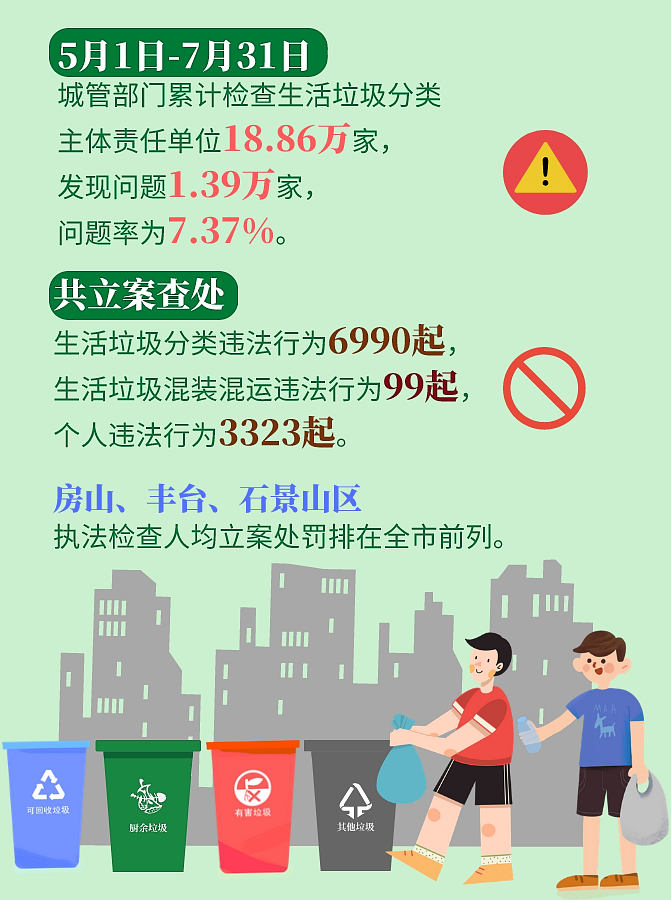 在此背景下,垃圾分類檢查執(zhí)法力度加強(qiáng)。5月1日至7月31日,執(zhí)法部門(mén)針對(duì)個(gè)人違法行為共查處3323起,查處個(gè)人違法行為的立案量占全部立案量的比例為58.20%。