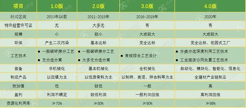 而4.0版是指在現(xiàn)代化工廠資源化處理的基礎上,再附加互聯(lián)網、衛(wèi)星定位等現(xiàn)代高端技術,將建筑垃圾資源化過程中的每一個環(huán)節(jié)精細化控制和處理,生產出利潤空間大、高附加值產品,盈利模式可以不再依靠政府補貼而進行市場化運營的發(fā)展模式。