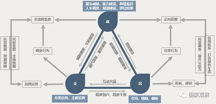 當(dāng)前,政、企、民三方各司其職,共同推進(jìn)垃圾分類。政府層面聚焦頂層規(guī)劃,企業(yè)著力于高效運(yùn)營,居民端發(fā)動全民參與。聯(lián)運(yùn)環(huán)境從企業(yè)角度分析了在此情況下,如何在政企民協(xié)同發(fā)展中嵌入信息化系統(tǒng),打造信息化閉環(huán)。