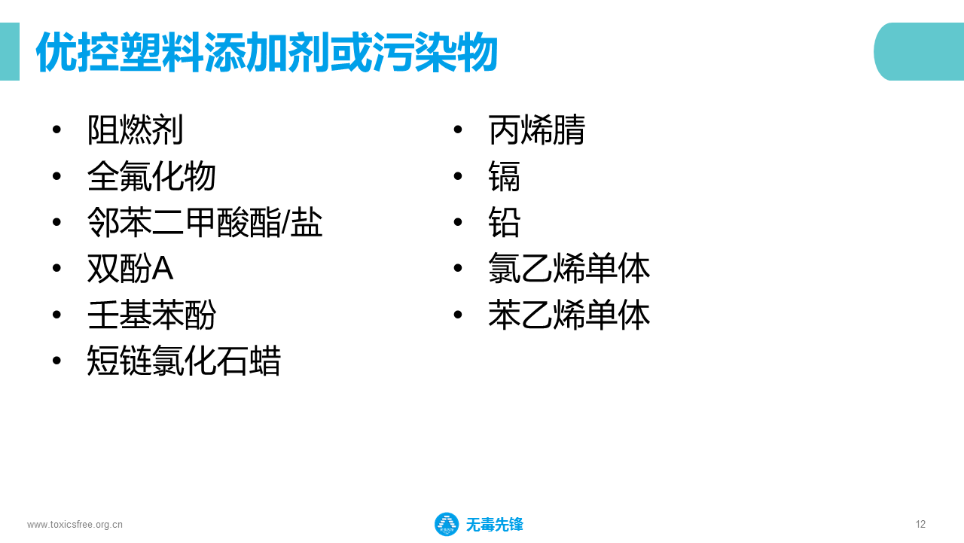 我們可以有一個抓手,抓重點。就是我們優(yōu)先關(guān)注這11種有毒塑料添加劑,同時這些有毒化學(xué)物質(zhì)最終還是會體現(xiàn)在產(chǎn)品當(dāng)中的,那也會有一個優(yōu)控產(chǎn)品名錄。當(dāng)我們進(jìn)行產(chǎn)品去毒和控制管理時,也就相當(dāng)于把有毒的化學(xué)物質(zhì)進(jìn)行控制。